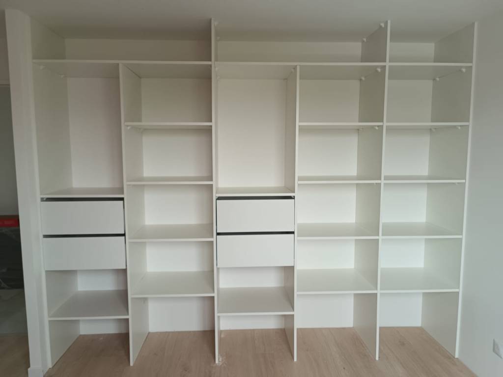 Nous avons fais une configuration en 3 partie. Pour les 2 premier grand rangement en hauteur qui font 120cm de large par 40cm de haut, et un petits qui fais 60cm de large par 40cm de haut. Pour la première partie des 120cm de large nous avons fais une séparation au milieu, pour faire d’un côté une penderie, une étagère, 2 tiroirs, et une étagère, de l’autre côté une ranger de 4 étagères. Pour la deuxième partie des 120cm c’est la même configuration et pour la 3ème et dernière partie c’est une colonne de 5 étagères.